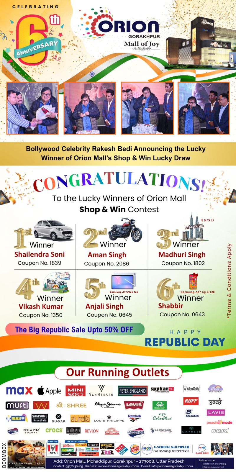 Orion Mall Gorakhpur proudly celebrated its 6th Anniversary with a grand Shop & Win Lucky Draw Event, marking a memorable milestone filled with excitement, rewards, and celebrations. Event Highlights The lucky draw was announced by Bollywood celebrity Rakesh Bedi, adding prominence to the occasion. The event witnessed enthusiastic participation from shoppers across the city. Winners […]